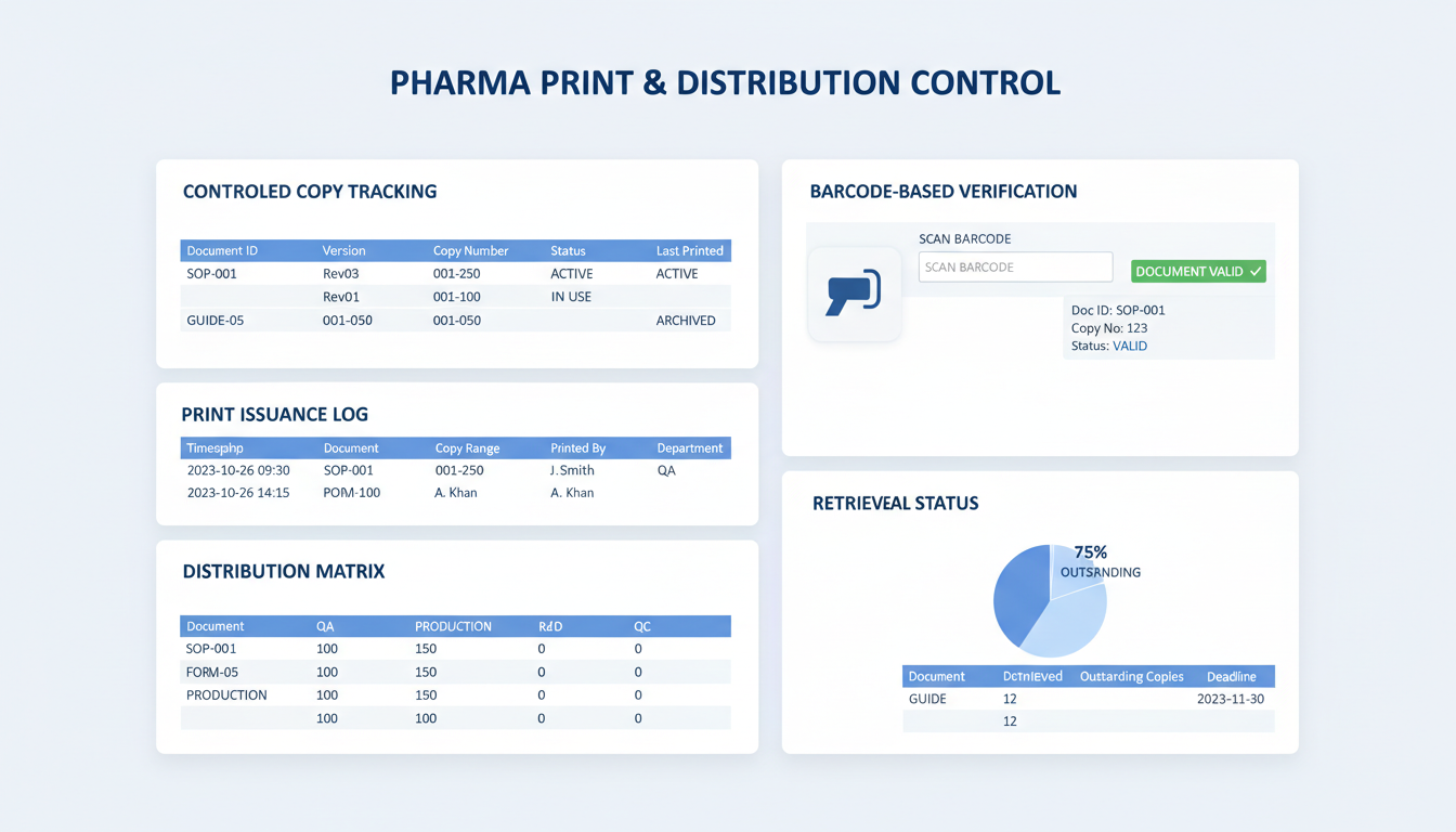 Track printing details and reconcile issued paper copies with audits for full pharmaceutical document control system traceability.