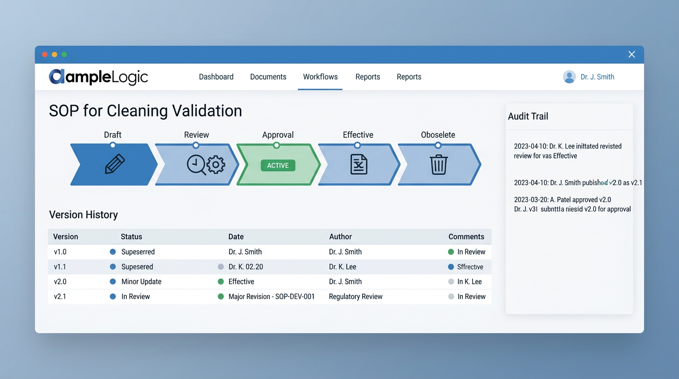 Document lifecycle management, regulatory compliance, controlled SOP management, and validated automation
