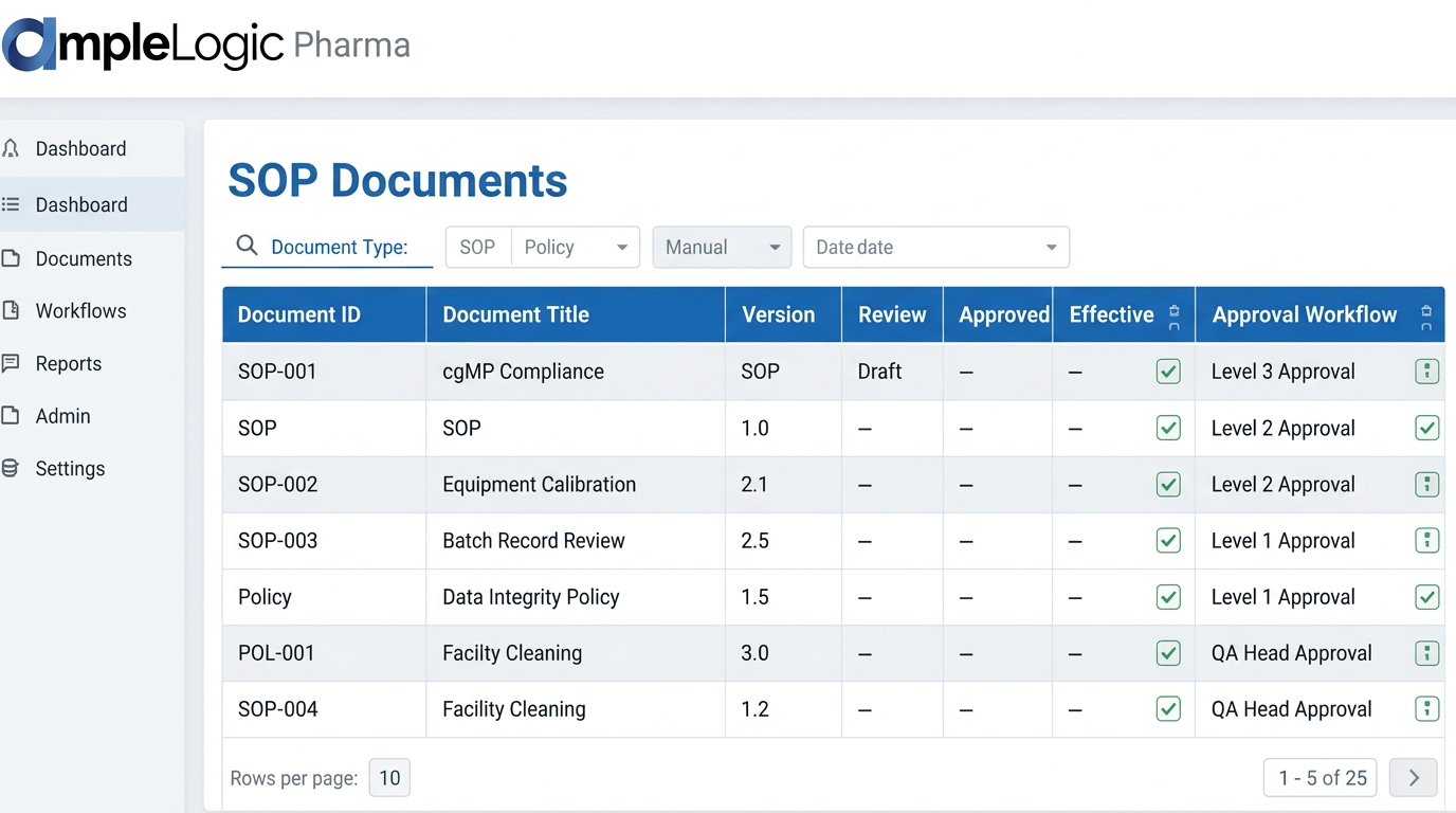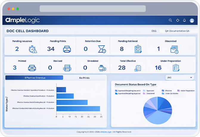 AmpleLogic's pharmaceutical document management software delivers enterprise-grade document control software with pharma-grade compliance, barcoding, controlled SOP management, print issuance, version and superseding controls, and intelligent automation.