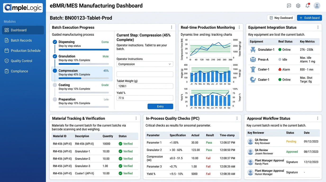 AmpleLogic eBMR/MES digitizes batch manufacturing with real-time shop floor execution, equipment integration, and review by exception -- cutting batch release time by 50% while maintaining full 21 CFR Part 11 compliance.